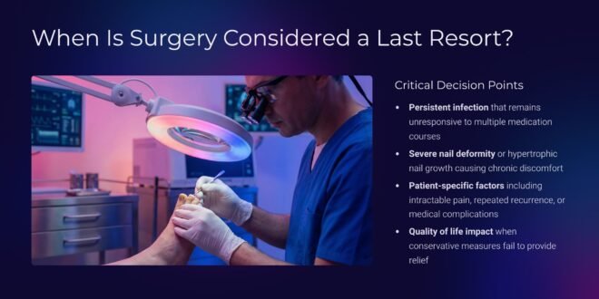 Surgical or chemical nail avulsion—the complete or partial removal of the infected nail plate—becomes necessary in cases of severe multiple nail infections resistant to other treatments. This approach physically eliminates the bulk of infected material while providing direct access to the nail bed for topical medication application. Complete nail avulsion is typically reserved for the most severe cases, while partial avulsion targeting only the most heavily infected portions offers a less invasive alternative.